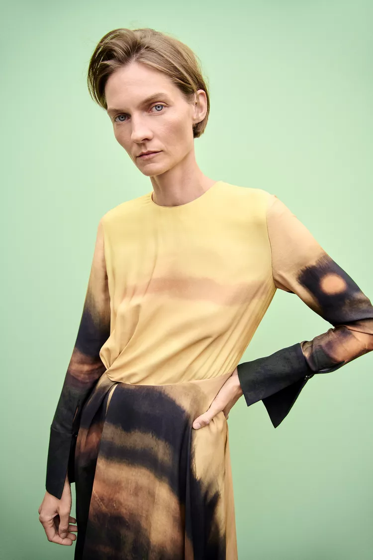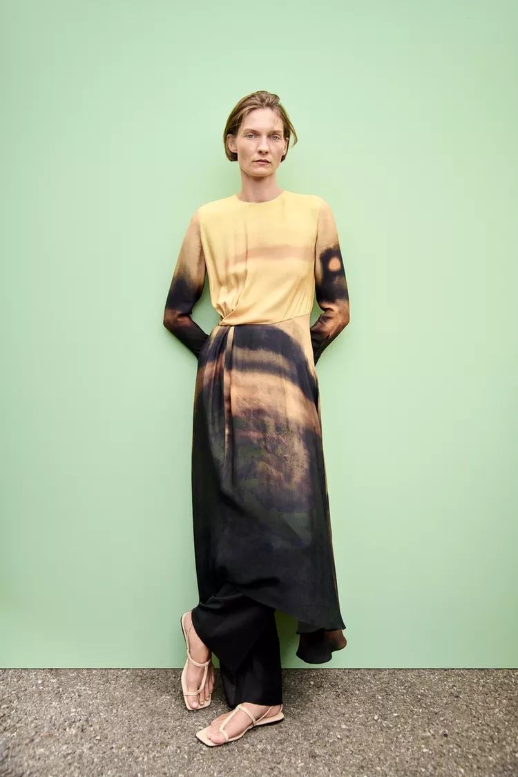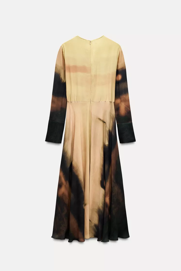 Este vestido midi está confeccionado en hilatura de viscosa 100%, brindando un toque de suavidad y comodidad al usuario. Su diseño cuenta con un cuello redondo y mangas largas acabadas en puño, ideales para realzar una silueta elegante y femenina.